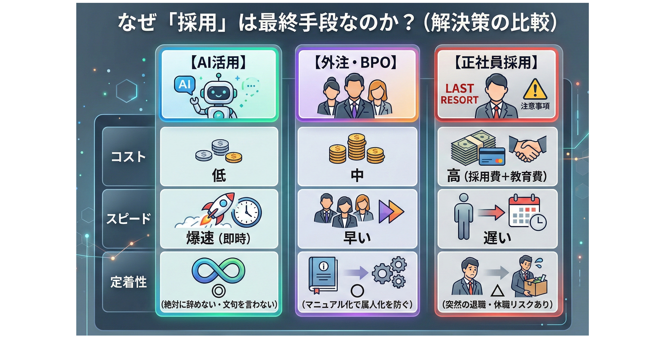 私たちは特定のサービスを押し売りしません。 まずは無料の「業務棚卸し」を行い、以下の手札から御社に最適なものをコーディネートします。 ① AI研修・AIツール提供(辞めずに働き続ける仕組み) AIを「知る」のではなく「実務で使う」ための支援です。 ChatGPTやNotebookLMなどを活用し、文章作成やデータ処理を爆速化。 「AIが文句を言わずに働き続ける状態」を作ります。 ② BPO・事務代行(属人化を壊し、退職リスクを消す) 「人がやらなくてもいい定型業務」を洗い出し、外部の専門ワーカーへ切り出します。 社員はコア業務に集中でき、突然の退職リスクにも怯えなくなります。 ③ 外部人事・人材紹介(どうしても必要な部分だけ補強) 業務の構造を整えた後、「それでもどうしても必要なポジション」に対してのみ、 外部人事・外国人人材・求人広告・人材紹介をご提案します。